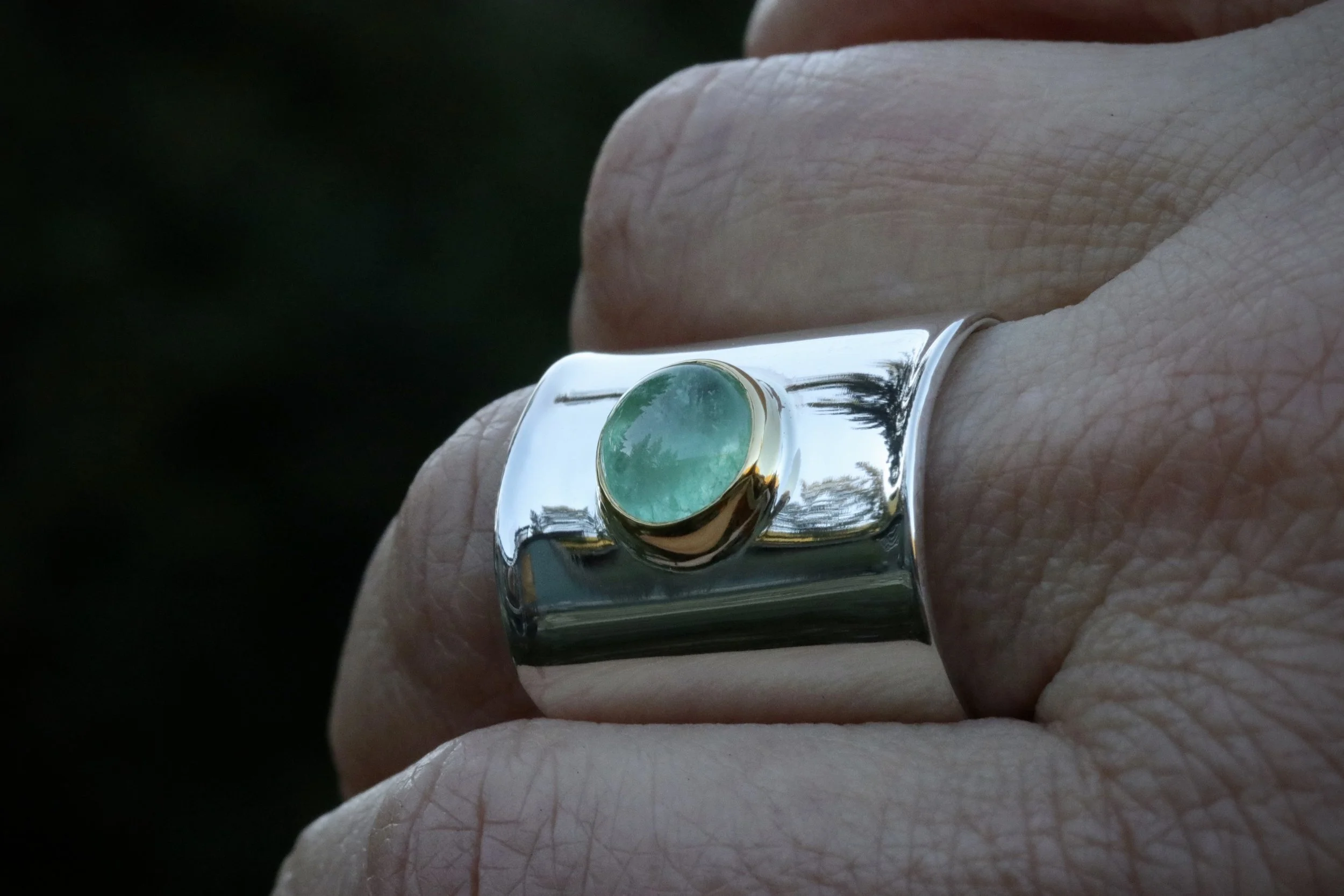 A deeply moving 8 carat green tourmaline cabochon that comes to a smooth top point. Set in 22 karat gold on a sterling silver cuff studded with ethically sourced white diamonds (1.4mm x 7 count). Exterior is brush finished and oxidized to a rich dark brown to black. Interior is left unoxidized and has a cross hatch brushed finish. Subtle shaping and curved edges give a smooth on and off. Cuff width of 31mm ( 1 & 1/4”). Sized to fit a standard medium wrist. Not made to squeeze or bend down to tighten! Adjustments can be made by me or at your favorite local jewelry store!